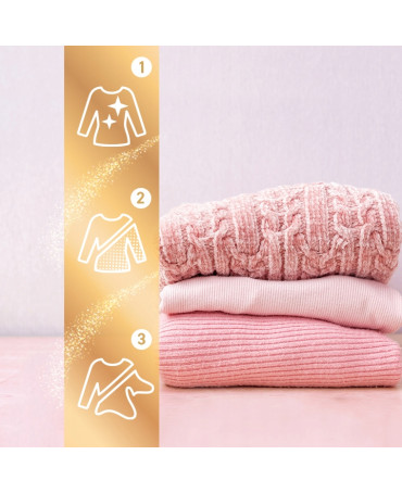 Unikatowa formuła różowego płynu Woolite z systemem Fiber-Flex pomaga zachować elastyczność tkanin oraz chroni je przed kurczeniem i rozciąganiem.