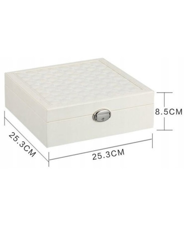 Funkcjonalny kuferek/etui na biżuterię i zegarki, nowy i wysokiej jakości, zapewniający eleganckie przechowywanie. Zamykany na solidny metalowy zamek z kluczykiem, pokryty estetycznym materiałem z miękkim wyściółką wewnątrz.