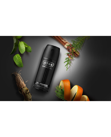 STR8 Original męski dezodorant zapachowy w sprayu o klasycznym i tajemniczym zapachu. To typowo męski zapach, który otwierają cudowne nuty ziół i japońskiej cytryny, płynnie przechodząc w nuty drzewne i korzenne, a dopełnieniem tej wyrafinowanej kompozycji są mocne nuty mchu oraz kadzidła.