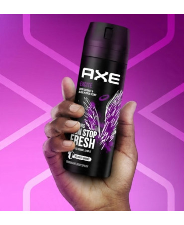 Wyczuwalne nuty w zapachu dezodorantu AXE Excite to: świeżość owoców, akordy czarnego pieprzu oraz akcenty wanilii i karmelu.