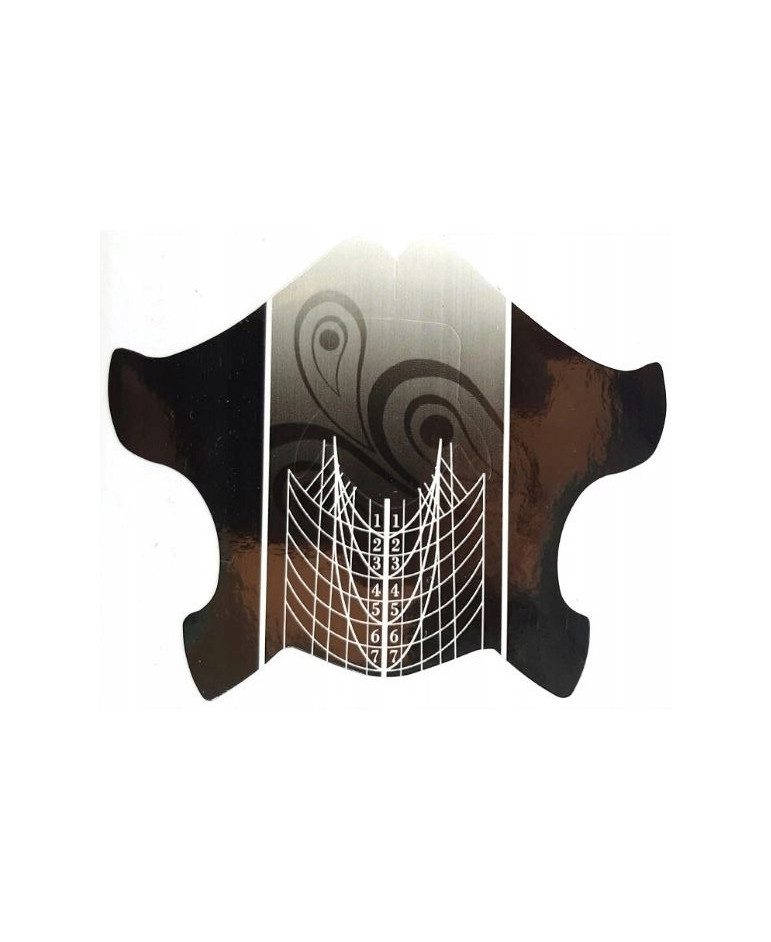 Sposób użycia: Formę podłóż pod wolny brzeg naturalnego paznokcia, zegnij i sklej pod palcem, tak aby nie było tam żadnej szczeliny. Nałóż żel lub akryl na szablonie od skórek do wolnego brzegu i utwardź jeśli to konieczne.