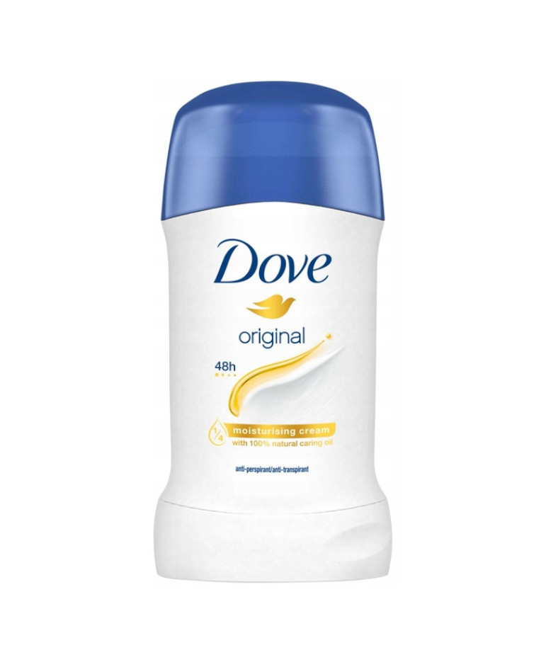 Antyperspirant w sztyfcie Dove Woman Original składa się w ¼ z kremu nawilżającego, pielęgnującego skórę pod pachami i zapewnia ochronę przed potem do 48 godzin.