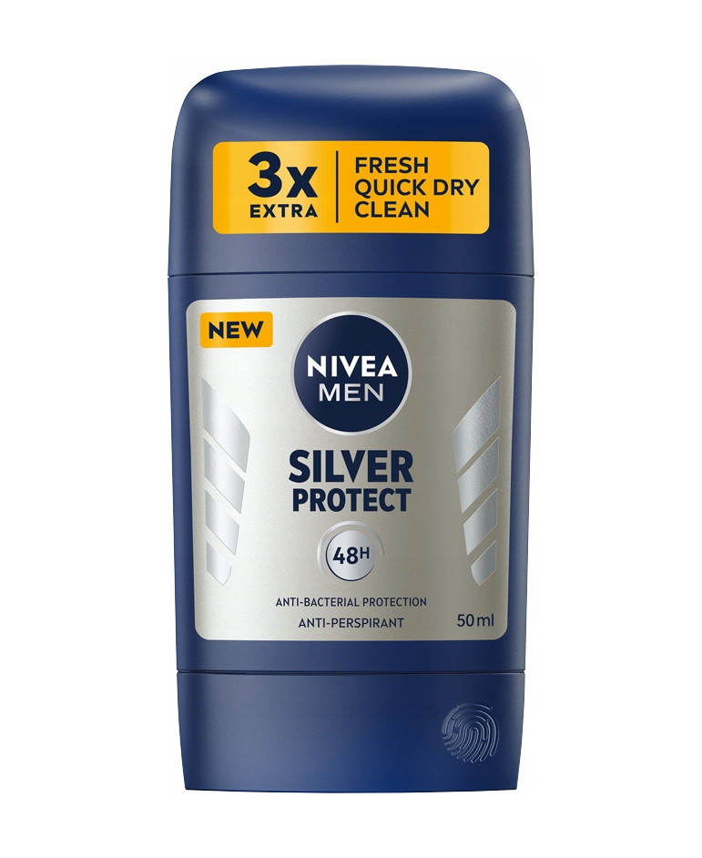 NIVEA MEN Silver Protect Antyperspirant dla mężczyzn w sztyfcie, dzięki innowacyjnej antybakteryjnej formule z jonami srebra skutecznie zapobiega powstawaniu nieprzyjemnego zapachu, a jego antyperspiracyjne działanie zapewnia długotrwałą, 48h ochronę przed nadmiernym poceniem się.