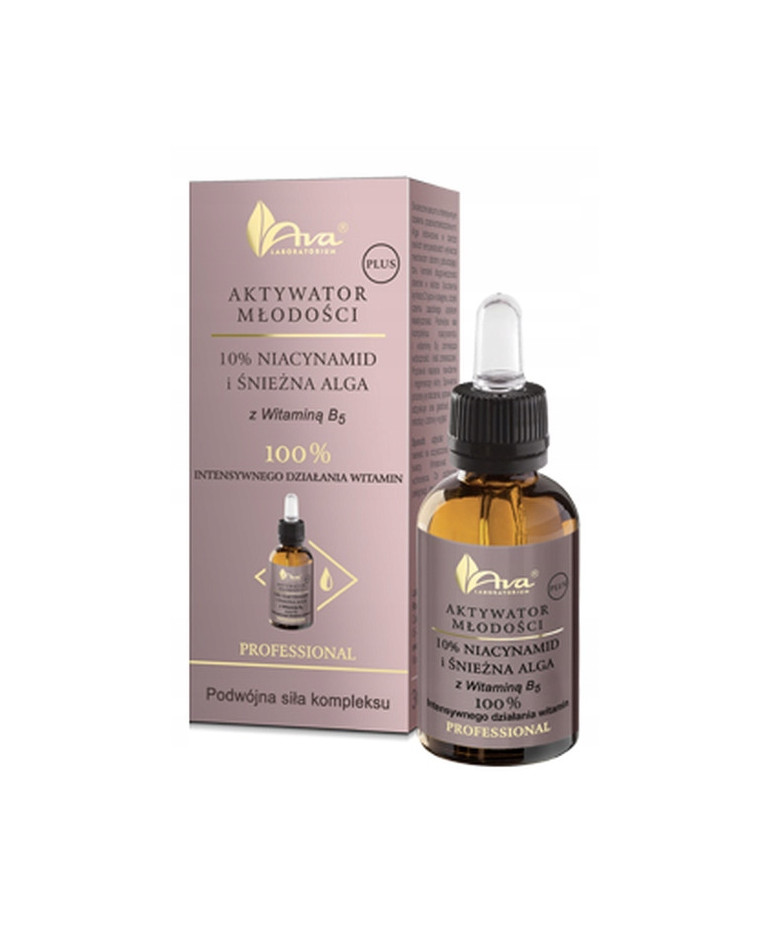 AVA Aktywator Młodości PLUS 10% NIACYNAMID i ŚNIEŻNA ALGA z witaminą B5 to skuteczne serum o intensywnym działaniu przeciwzmarszczkowym. Innowacyjny ekstrakt ze śnieżnej algi, rosnącej w niskich temperaturach, pobudza naturalne procesy regeneracji skóry. Uruchamia syntezę 2 typów kolagenu, dzięki czemu zapobiega ubytkom elastyczności.
