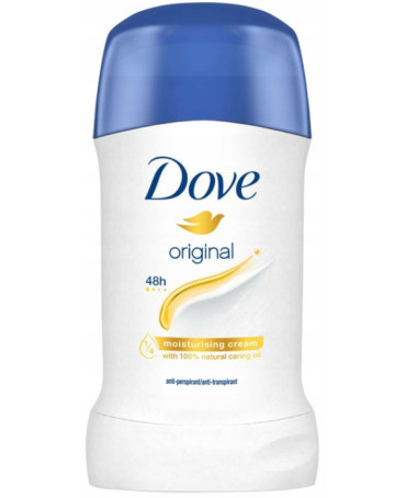 Antyperspirant w sztyfcie Dove Woman Original składa się w ¼ z kremu nawilżającego, pielęgnującego skórę pod pachami i zapewnia ochronę przed potem do 48 godzin.