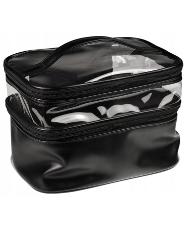 Kuferek kosmetyczny w kolorze czarnym. Podwójny z transparentną górą. Pojemny i elegancki. Pomieści zarówno kosmetyki kolorowe jak i te przeznaczone do pielęgnacji.
