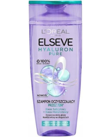 L'OREAL ELSEVE Hyaluron Pure Szampon oczyszcza skórę głowy i oferuje nawilżenie bez obciążania włosów.