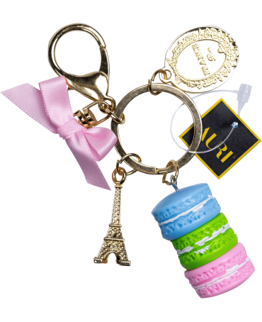 Stylowy Brelok marki Auri dziewczęcy brelok z kolorowymi makaronikami i wieżą Eiffla. Świetny dodatek do kluczy lub plecaka oraz jako ozdoba do torebki. Lekki i elegancki dodatek o ponadczasowym modnym i jednocześnie klasycznym charakterze.