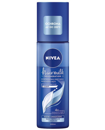 NIVEA Ekspresowa odżywka regenerująca do włosów o normalnej strukturze Hairmilk z naturalnymi proteinami mleka pielęgnuje i odbudowuje każdy kosmyk włosów, bez ich obciążania. Włosy zyskują wspaniały wygląd i zupełnie nowe życie.
