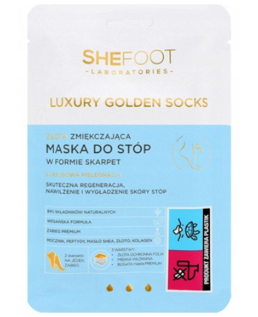 LUXURY GOLDEN SOCKS to luksusowa maska do stóp w formie efektownych złotych skarpetek. To zabieg PREMIUM, który przywraca stopom niezwykłą miękkość, aksamitną gładkość, a skórze promienność i zadbany wygląd. Maska niweluje szorstkość, zmniejsza suchość oraz dyskomfort naskórka, sprawiając że skóra stóp odzyskuje komfort i właściwą kondycję.