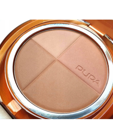 Ten kompaktowy bronzer ma tę zaletę, że ma wiele efektów: 4 odcienie, naturalny i matowy, do stosowania indywidualnie lub w połączeniu w zależności od pory roku i karnacji, aby uzyskać stopniowy efekt opalenizny.