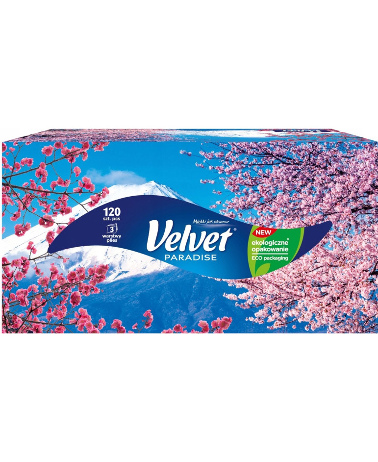 Delikatne i wytrzymałe chusteczki uniwersalne Velvet zostały umieszczone w pięknych, kolorowych pudełkach.