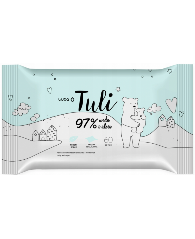 Wyjątkowo delikatne, pielęgnujące chusteczki nawilżane Luba Tuli o prostym składzie na bazie 97% wody i aloesu.