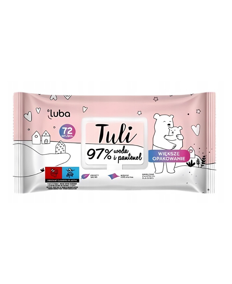 LUBA Tuli to produkty dla niemowląt i dzieci, które służą do oczyszczania, pielęgnacji i odświeżania skóry małych dzieci. Woda i pantenol, którym nasączone są chusteczki, z powodzeniem oczyszczą skórę w okolicy pieluszkowej. Nie ma potrzeby stosowania dodatkowych środków, by umyć pupę malucha przy zmianie pieluszki.