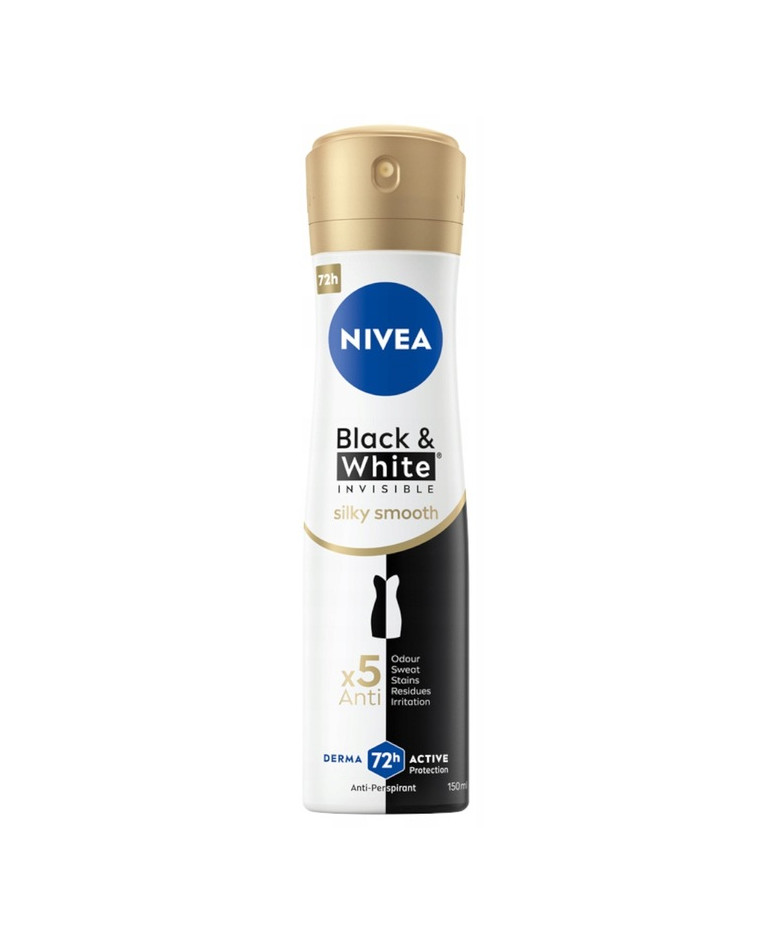 Wypróbuj antyperspirant w spray'u NIVEA Black&White Invisible Silky Smooth zapewniający ochronę przed białymi śladami na czarnych ubraniach i zapobiegający powstawaniu żółtych plam na białych ubraniach.