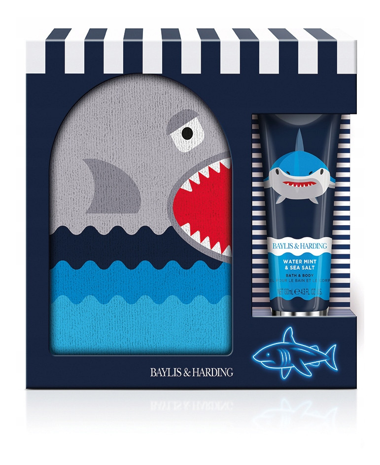 Zestaw upominkowy Baylis & Harding Shark Mitt, składający się z żelu pod prysznic oraz rękawicy do mycia. Popływaj w głębinach z naszą najnowszą kolekcją dla dzieci! Zestaw o zapachu orzeźwiającej mięty i soli morskiej.