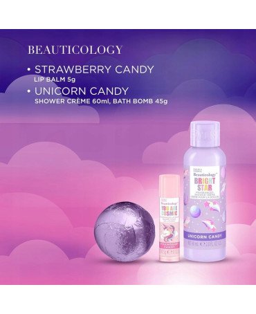 Kolekcja BEAUTICOLOGY łaczy w sobie tęczowy blask , ładne pastele magiczne jednorożce. Łączy zapachy cukierków jednorożca, truskawkowych gwiazdek i miętowego lukru. Jest ona zabawna i kusząca