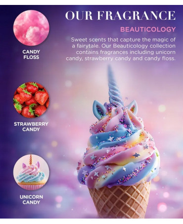 Idealne, urzekajace słodkie zapachy inspirowane słodyczami dodają odrobinę świątecznego uroku, czyniąc ją idealnym prezentem dla miłośników jednorożców.