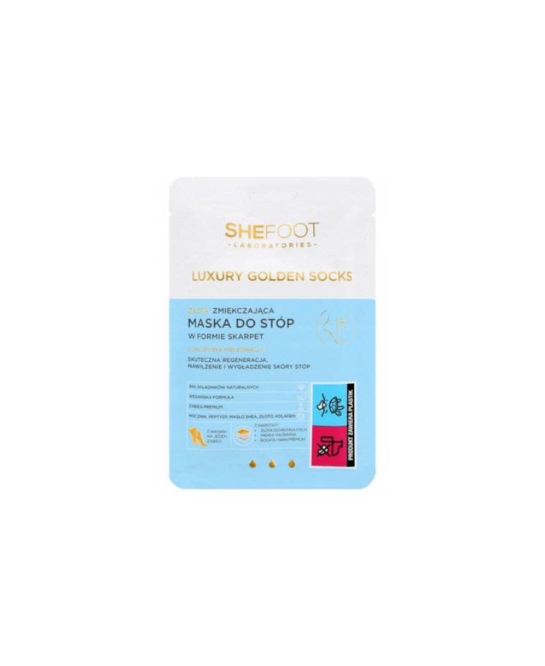LUXURY GOLDEN SOCKS to luksusowa maska do stóp w formie efektownych złotych skarpetek. To zabieg PREMIUM, który przywraca stopom niezwykłą miękkość, aksamitną gładkość, a skórze promienność i zadbany wygląd. Maska niweluje szorstkość, zmniejsza suchość oraz dyskomfort naskórka, sprawiając że skóra stóp odzyskuje komfort i właściwą kondycję.
