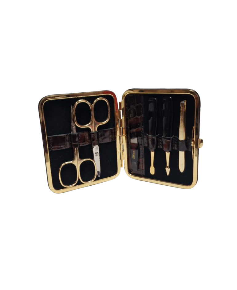 Profesjonalny zestaw do manicure w eleganckim, poręcznym etui zamykanym na zatrzask. Zewnętrzna część etui jest wykonana z lakierowanej skóry. Elementy zestawu zostały wykonane z wysokiej jakości nierdzewnej stali chirurgicznej pokrytej częściowo materiałem imitującym złoto. Niezastąpiony zarówno w podróży jak i na co dzień. Idealnie nadaje się na prezent.