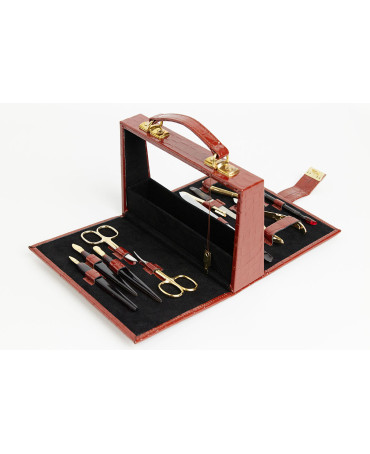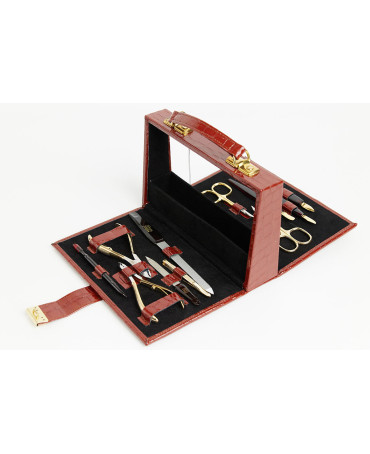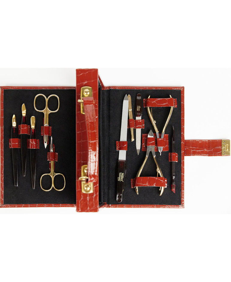 Profesjonalny zestaw do manicure w eleganckim, poręcznym kuferku. Zewnętrzna część etui jest wykonana z lakierowanej skóry. Elementy zestawu zostały wykonane z wysokiej jakości nierdzewnej stali chirurgicznej pokrytej częściowo materiałem imitującym złoto.