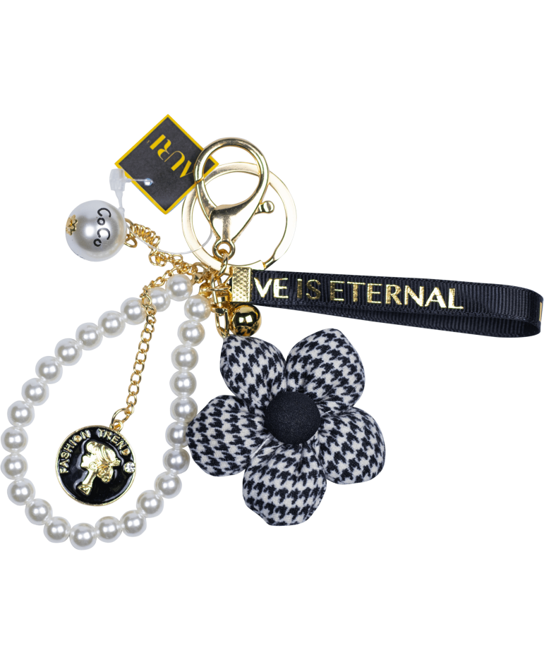 Stylowy Brelok marki Auri z modnym motywem klasycznego materiałowego kwiatka z perłami, ozdobionego ponadczasowym wzorem w pepitkę.Świetny dodatek do kluczy lub plecaka oraz jako ozdoba do torebki. Lekki i elegancki dodatek o ponadczasowym modnym i jednocześnie klasycznym charakterze.