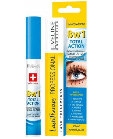 8 w 1 Total Action skoncentrowane serum do rzęs to innowacyjny produkt, który łączy w sobie właściwości serum odbudowującego, aktywatora wzrostu rzęs oraz bazy pod tusz