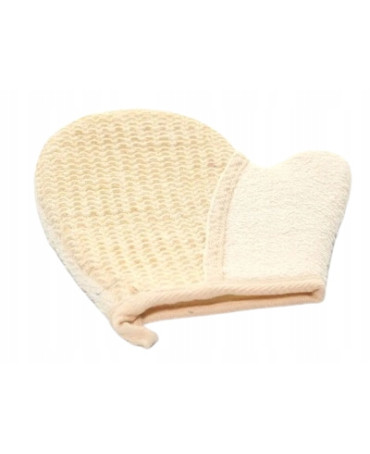 Dwustronna sizalowo-frottowa rękawica do mycia, peelingu i masażu, wykonana z 100% naturalnych materiałów. Jedna strona wykonana z bawełny, druga z sizalu - włókna naturalnego, pozyskiwanego ze specjalnego gatunku agawy.