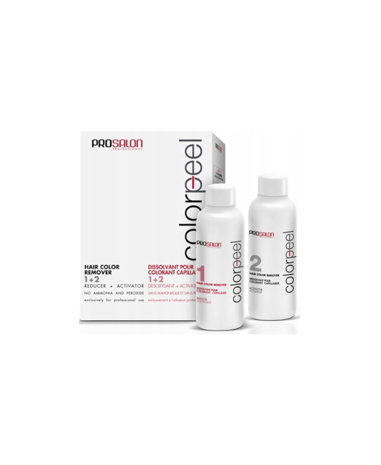 Nie zawiera amoniaku oraz wody utlenionej. Color peel jest produktem dwufazowym do łączenia w stosunku 1:1. W zależności od długości włosów należy dobrać odpowiednią ilość kosmetyku. Jeden zestaw (reduktor to butelka nr 1, aktywator to butelka nr 2) wystarcza na jedną aplikację dla włosów półdługich.