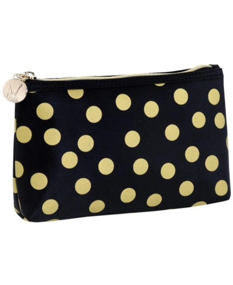 Kolekcja kosmetyczek w złote kropki powstała z myślą o kobietach cieniących sobie funkcjonalność, ponadczasowość, a przede wszystkim elegancje. Kosmetyczka zamykana na suwak w złotym kolorze.