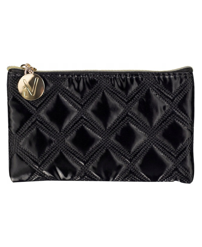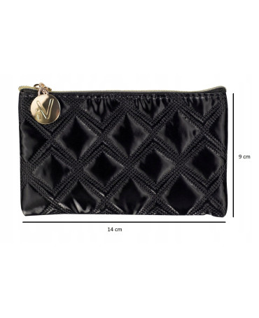 Kosmetyczka może być stosowana zarówno w domu, jak i podróży. Wykonana została z pikowanego materiału, w odcieniu klasycznej czerni, który jest bardzo łatwy w utrzymaniu czystości. Całość wyposażona została w złoty zamek błyskawiczny.