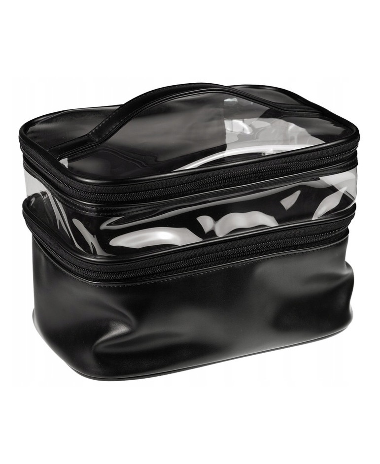 Kuferek kosmetyczny w kolorze czarnym. Podwójny z transparentną górą. Pojemny i elegancki. Pomieści zarówno kosmetyki kolorowe jak i te przeznaczone do pielęgnacji. Kuferek posiada dwie przegrody zamykane na wygodny suwak.