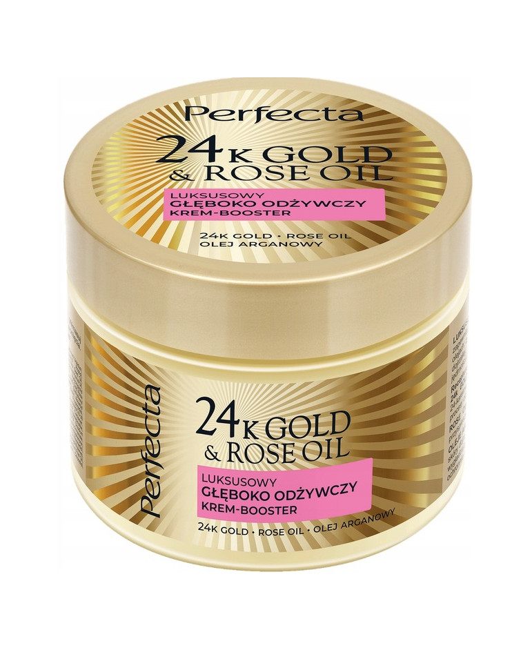 Perfecta 24K Gold & Rose Oil to niezwykle luksusowy krem - booster do ciała, który zapewni Twojej skórze prawdziwie odżywcza pielęgnację. Jego niezwykła formula oparta na molekułach złota oraz trzech naturalnych olejkach - arganowym, jojoba oraz różanym widocznie poprawia kondycję oraz wygląd dojrzałej skóry.