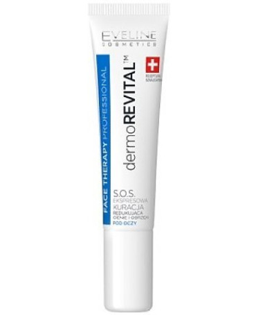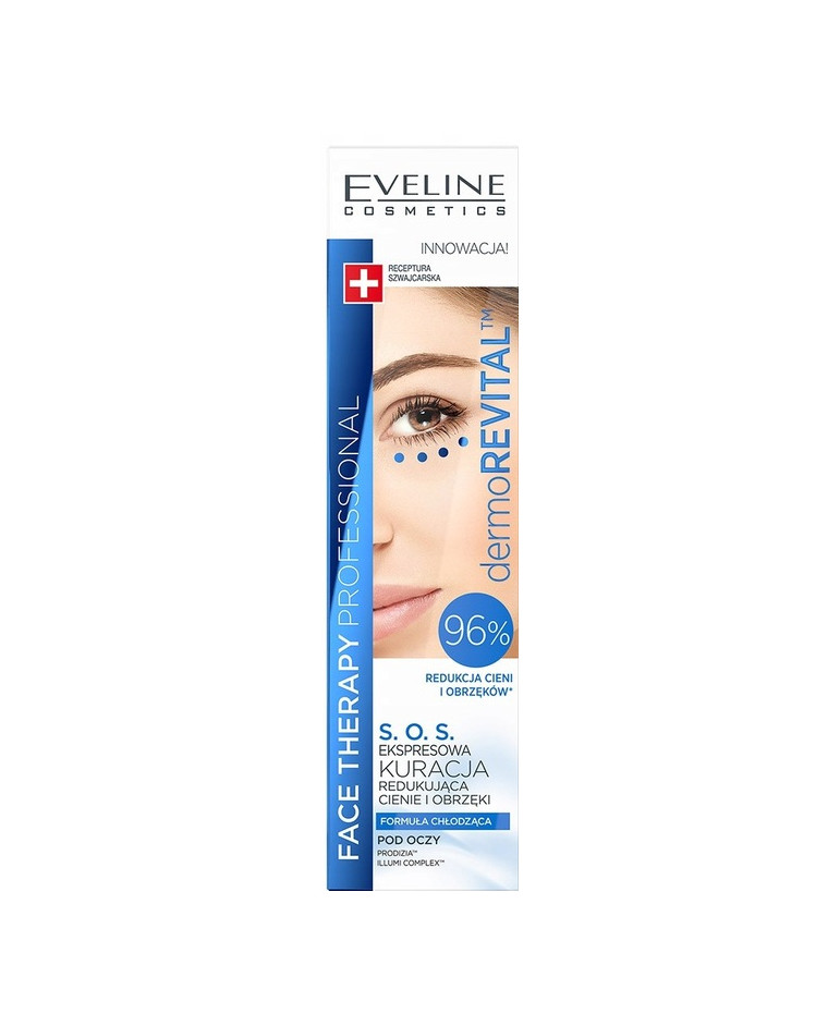 Eveline Cosmetics Face Therapy S.o.s. to ekspresowa kuracja redukująca cienie i obrzęki pod oczy z serii dermoREVITAL™, która została opracowana z myślą o najwyższych standardach skuteczności, bezpieczeństwa i łagodności dla skóry. Korzystając z innowacyjnych technologii i wysokich stężeń substancji aktywnych, ta kuracja zapewnia spektakularny efekt odmłodzenia skóry już po kilku minutach od aplikacji
