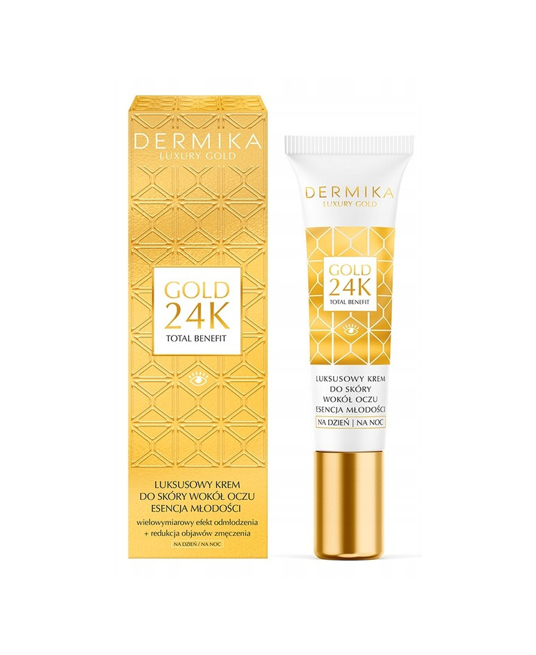 Krem Dermika Luxury Gold 24k Total Benefit to intensywna i całościowa kuracja odmładzająca wygląd. Formuła z technologią kompleksowej odnowy Total Benefit zapewnia wielowymiarowe korzyści, harmonizujące z potrzebami Twojej skóry. Doda subtelnego blasku spojrzeniu, abyś wyglądała młodziej.