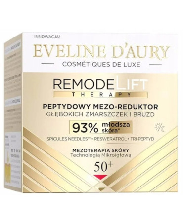 Eveline D’Aury RemodeLift Therapy Peptydowy mezo-reduktor głębokich zmarszczek i bruzd 50+to zaawansowany krem, inspirowany zabiegami mikroigłowej mezoterapii. Technologia Spicules Needles™– wykorzystuje właściwości mikroigieł z gąbki słodkowodnej Spongilla Spicule, inicjując efektywne procesy odmładzające.