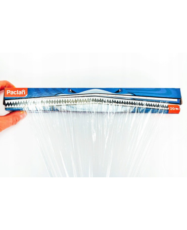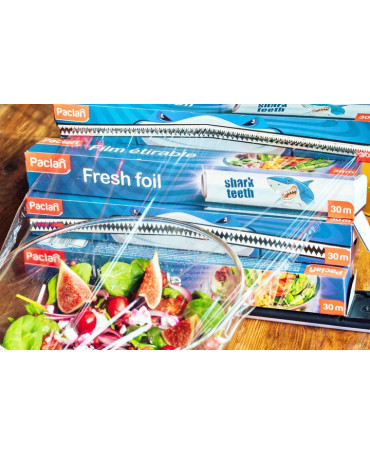 PACLAN FOLIA SPOŻYWCZA z Odcinaczem - Kły Rekina to niezastąpiony pomocnik w codziennej kuchennej pracy. Folia spożywcza ma wiele zastosowań w kuchni. Możesz ją użyć do przykrywania pojemników z żywnością w lodówce, aby zachować jej świeżość. Ponadto, chroni jedzenie przed wysychaniem i zapachami w lodówce, oraz może być używana jako bariera przed owadami podczas posiłków na zewnątrz
