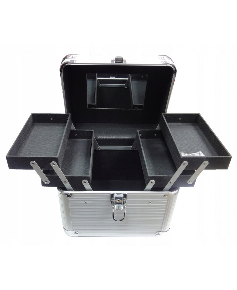 Kuferek usztywniany, wykonana z ładnego, nieprzemakalnego materiału w kolorze czarny, środek wykonany z szarej podszewki. W środku na ściance dookoła gumka podtrzymując np. butelki w pionie. Na pokrywie małe lusterko.