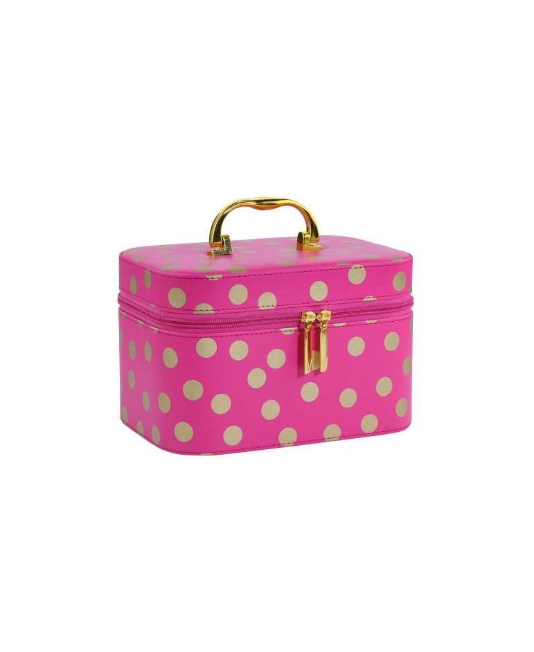 Kuferek został wykonany ze sztywnego łatwego w utrzymaniu czystości materiału, eko-skóry. Na kuferku nadrukowane kropki w kolorze złotym. Środek kuferka wyłożony różowym miłym w dotyku materiałem.