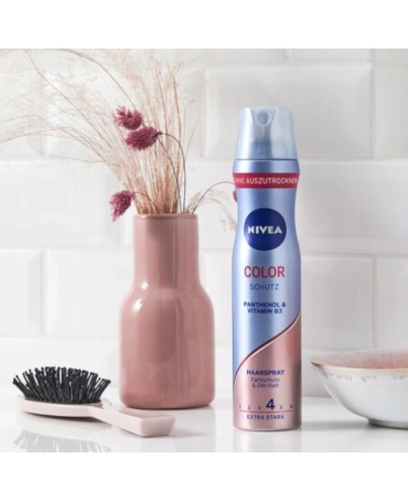 Nowa, ulepszona formuła lakieru do włosów farbowanych NIVEA z pantenolem i witaminą B3 wzmacnia i chroni strukturę włosa.