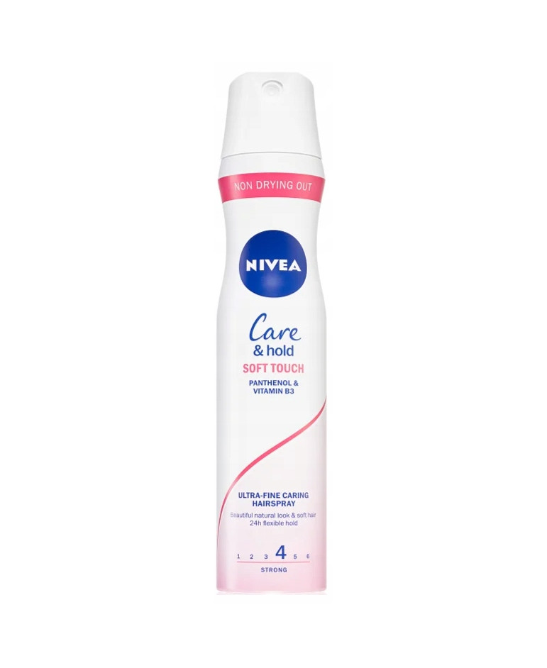 Odpowiedni do każdego rodzaju włosów, spray NIVEA Care & Hold Soft Touch nie wysusza, ale odżywia i utrzymuje fryzurę stabilną przez 24 godziny. Włosy będą wyglądać naturalnie, będą miękkie, bez uczucia ciężkości i lepkości.