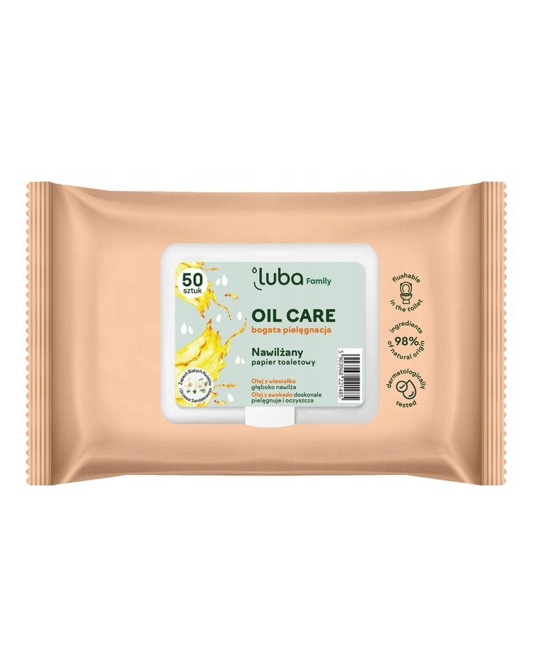 LUBA Family OIL CARE to nawilżany papier toaletowy o wyjątkowej recepturze wzbogaconej w starannie dobrane, naturalne olejki. Olej z awokado znany jest ze swoich właściwości pielęgnujących i oczyszczających, zapewniając skórze odżywienie i regenerację. Olej z wiesiołka skutecznie nawilża oraz wzmacnia naturalną barierę ochronną skóry, a olej z bawełny działa odżywczo i regenerująco, przywracając komfort i miękkość.