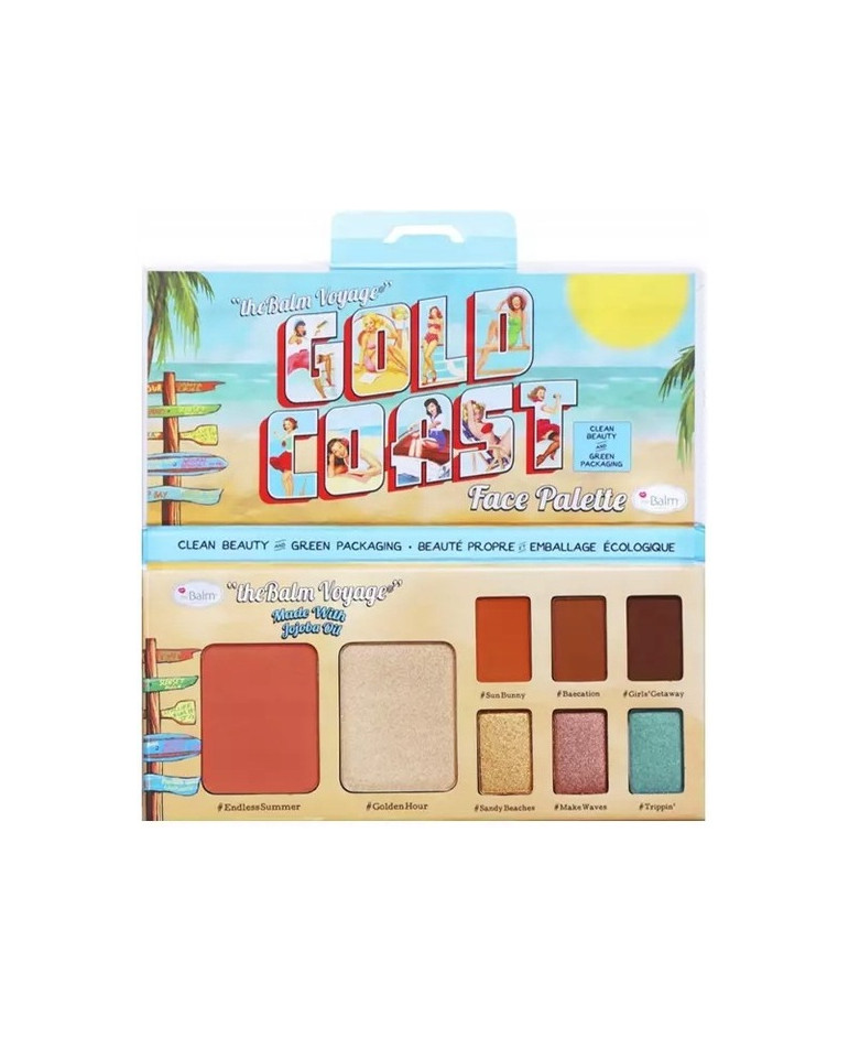 Paleta do Makijażu Gold Coast zawiera róż, rozświetlacz i sześć cieni do powiek. Posiadają one bogato napigmentowaną i długotrwałą formułę. Wzbogacone organicznym olejejm jojoba i z pestek winogron.