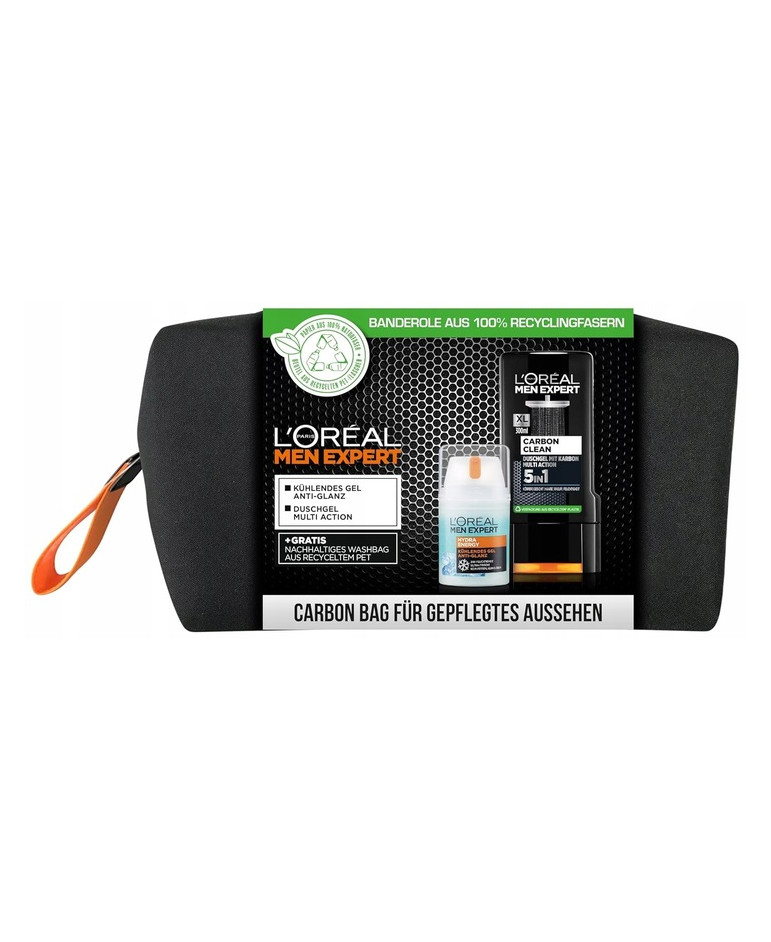 Zestaw upominkowy L'Oréal Men Expert dla mężczyzn, zawierający żel pod prysznic 5 w 1 Carbon Clean i chłodzący krem nawilżający Hydra Energy, zawiera kosmetyczkę.