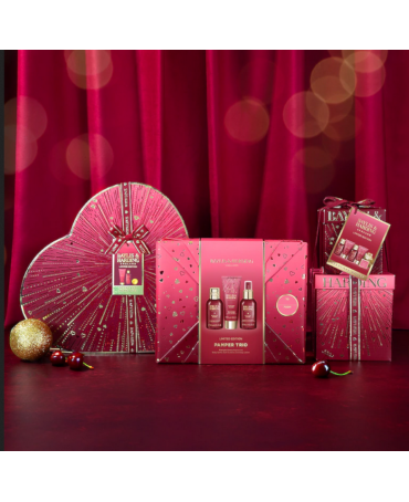 Soczysty zapach słodkich i kwaśnych wiśni, migdałów i likieru pachnie jak świeżo upieczone świąteczne ciasto. Pięknie zapakowane kosmetyki i gotowe, by umieścić je pod choinką.
