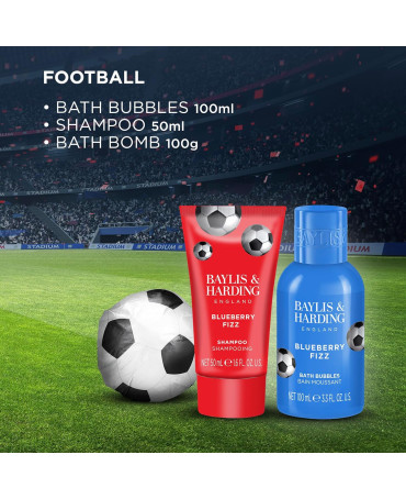 Zestaw prezentowy Baylis & Harding Football to doskonały wybór dla małych miłośników piłki nożnej. Pokaż, jak wielkim fanem piłki nożnej jesteś, z tą kosmetyczką wypełnioną pomeczowymi przysmakami, w tym 100 ml płynu do kąpieli, 50 ml szamponu i 100 g kuli do kąpieli o zapachu musującej jagody.