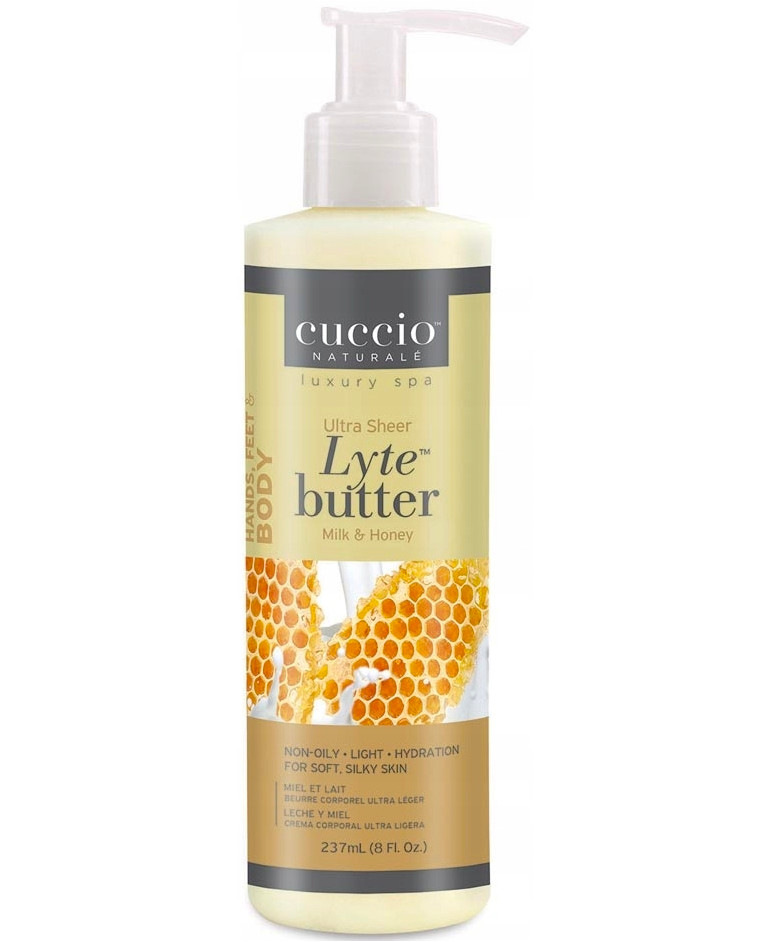 Cuccio Lyte Butter to lekkie masło do ciała o bogatym składzie, które zapewnia intensywne nawilżenie i odżywienie skóry. Specjalnie opracowana formuła tego masła koi skórę wysuszoną słońcem, kąpielami morskimi i chlorowaną wodą, pozostawiając ją miękką, gładką i odżywioną.