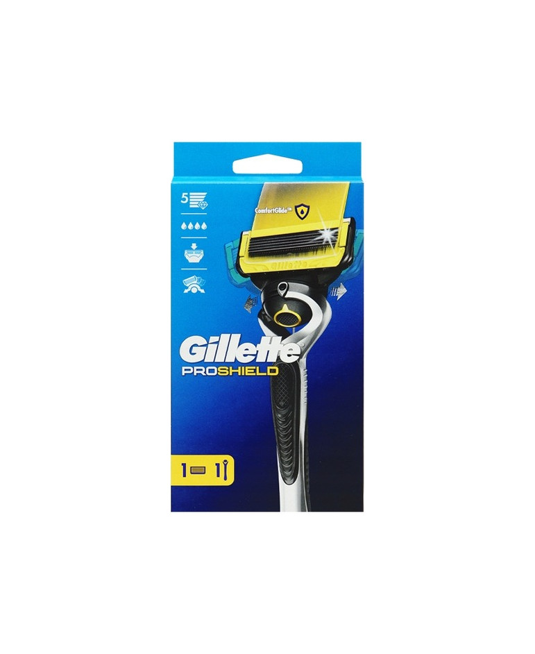 Maszynka do golenia dla mężczyzn Gillette ProShield z ochroną skóry przed i za ostrzami chroni skórę przed podrażnieniami i zapewnia uczucie chłodzenia i odświeżenia podczas golenia, zapewniając dokładne i wygodne golenie.