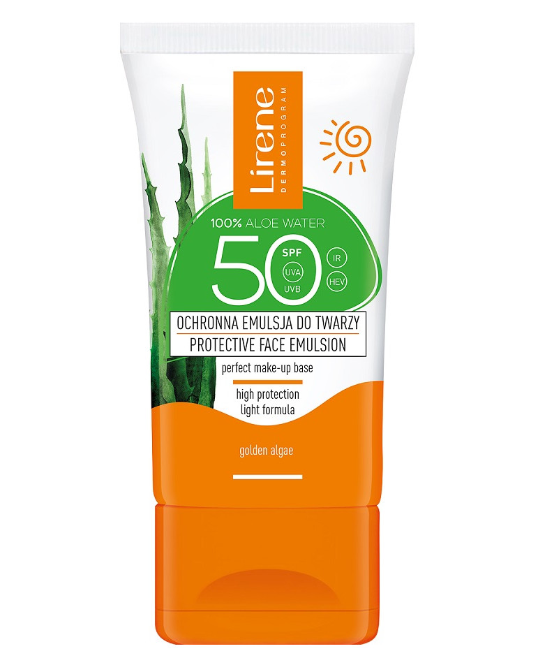 Emulsja ochronna do twarzy SPF50 50ml od Lirene z serii Sun Protect to produkt zapewniający kompleksową ochronę przed promieniowaniem UVA, UVB oraz HEV. Posiada specjalny składnik IR Complex, który niweluje skutki promieniowania podczerwonego, wzmacniając jednocześnie barierę hydrolipidową skóry i działając ochronnie na DNA komórek.