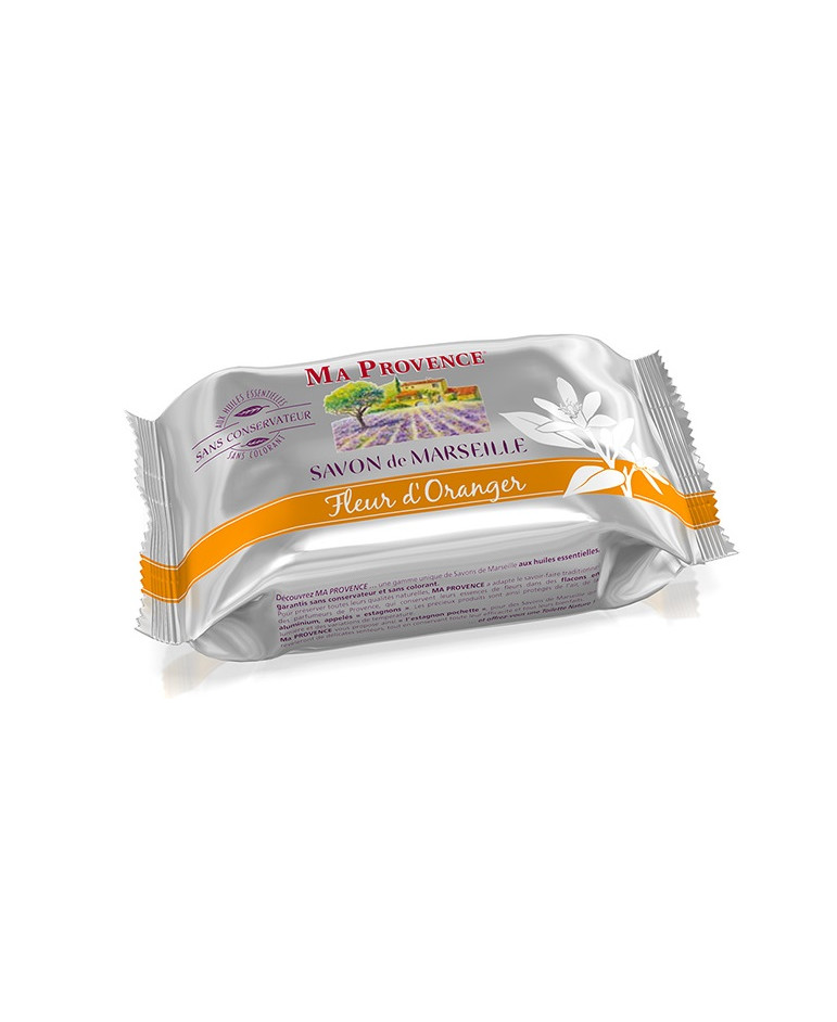 Klasyczne mydło marsylskie w kostce wzbogacone o naturalny, świeży zapach kwiatu pomarańczy, firmy MA PROVENCE.